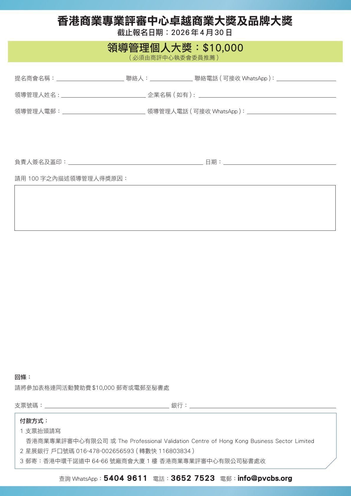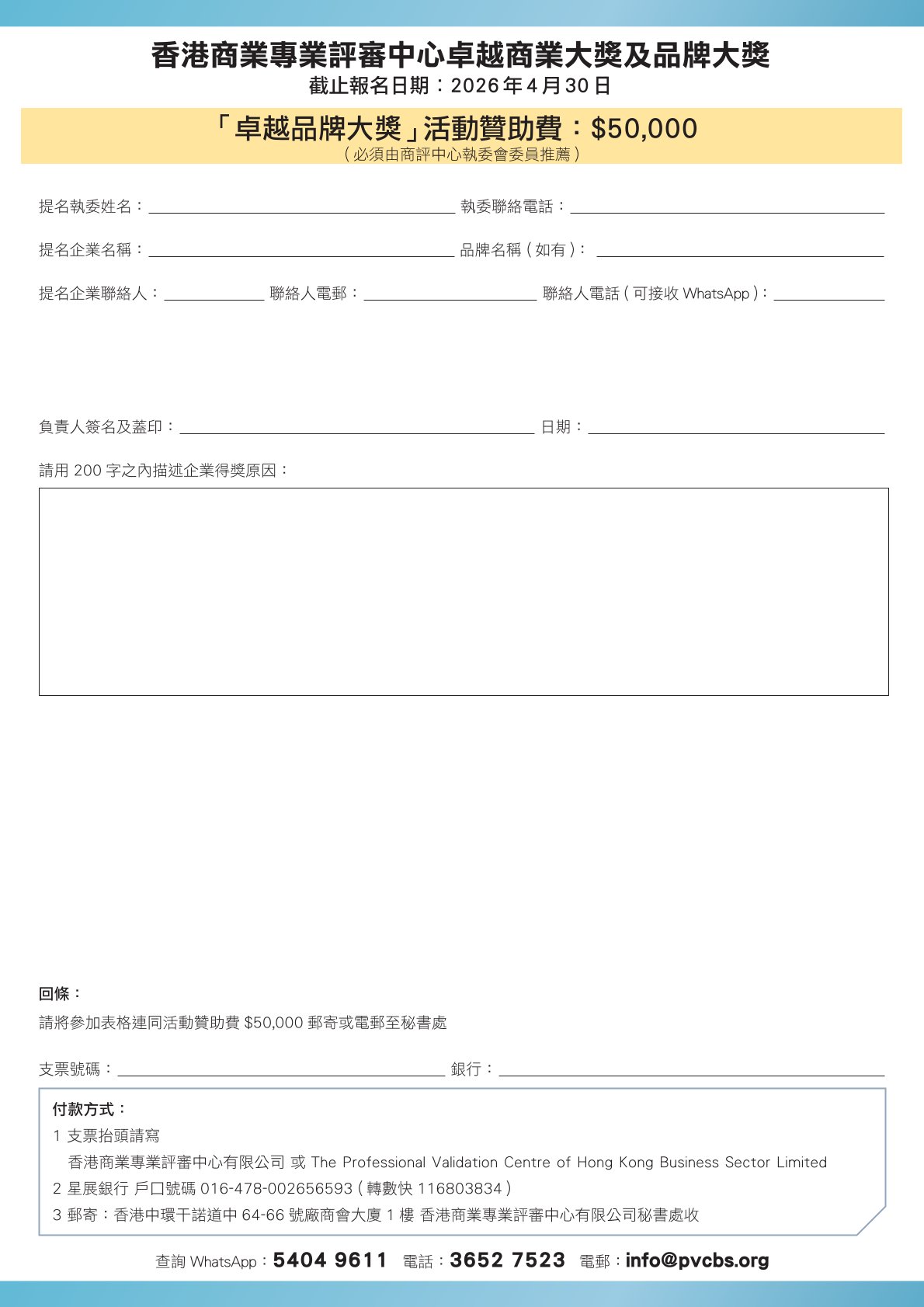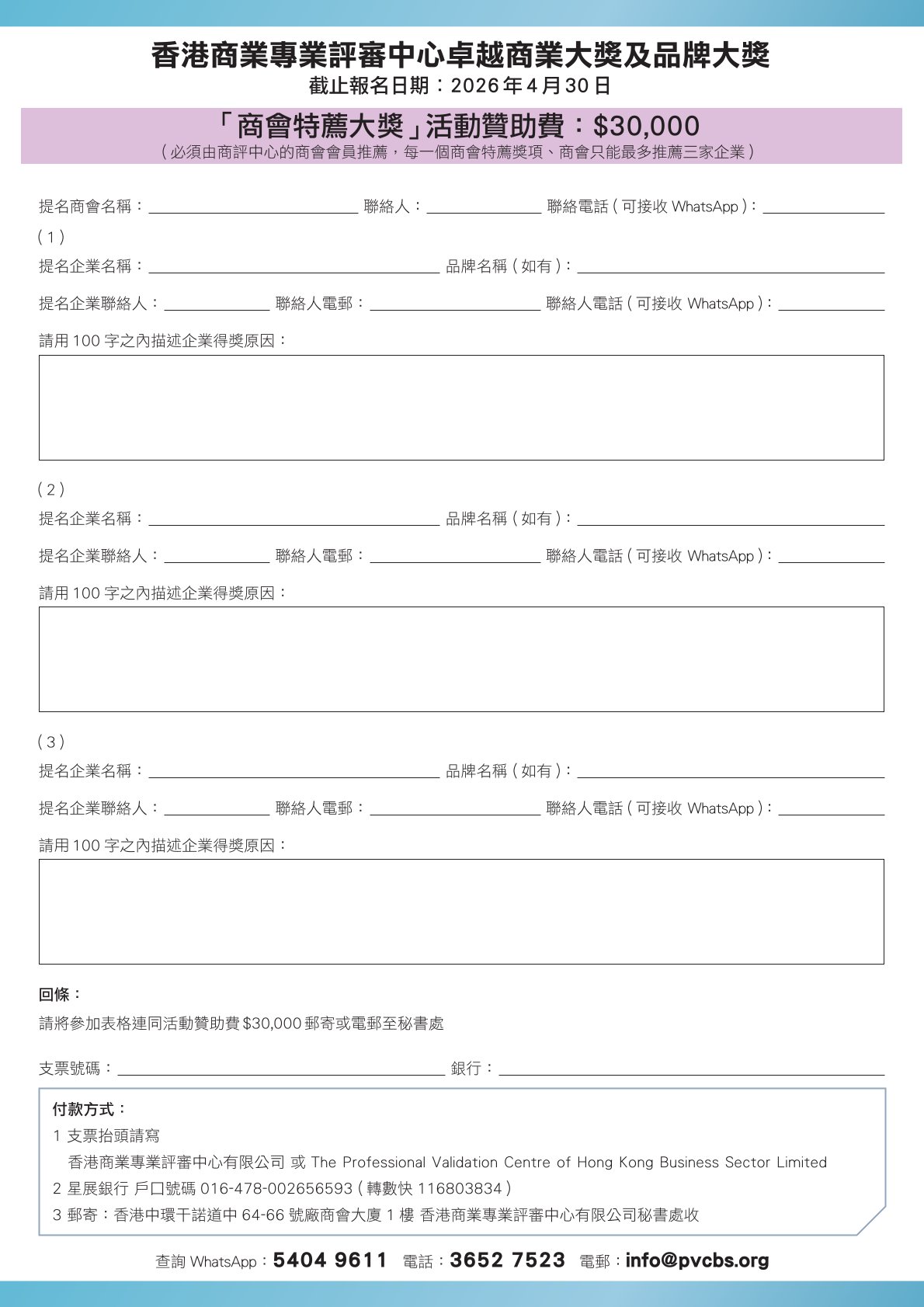 如在填寫表格時有任何查詢,可WhatsApp 5404 9611李小姐 或 致電本會秘書處3652 7523;電郵: info@pvcbs.org;期盼收到 閣下的熱烈參與。
