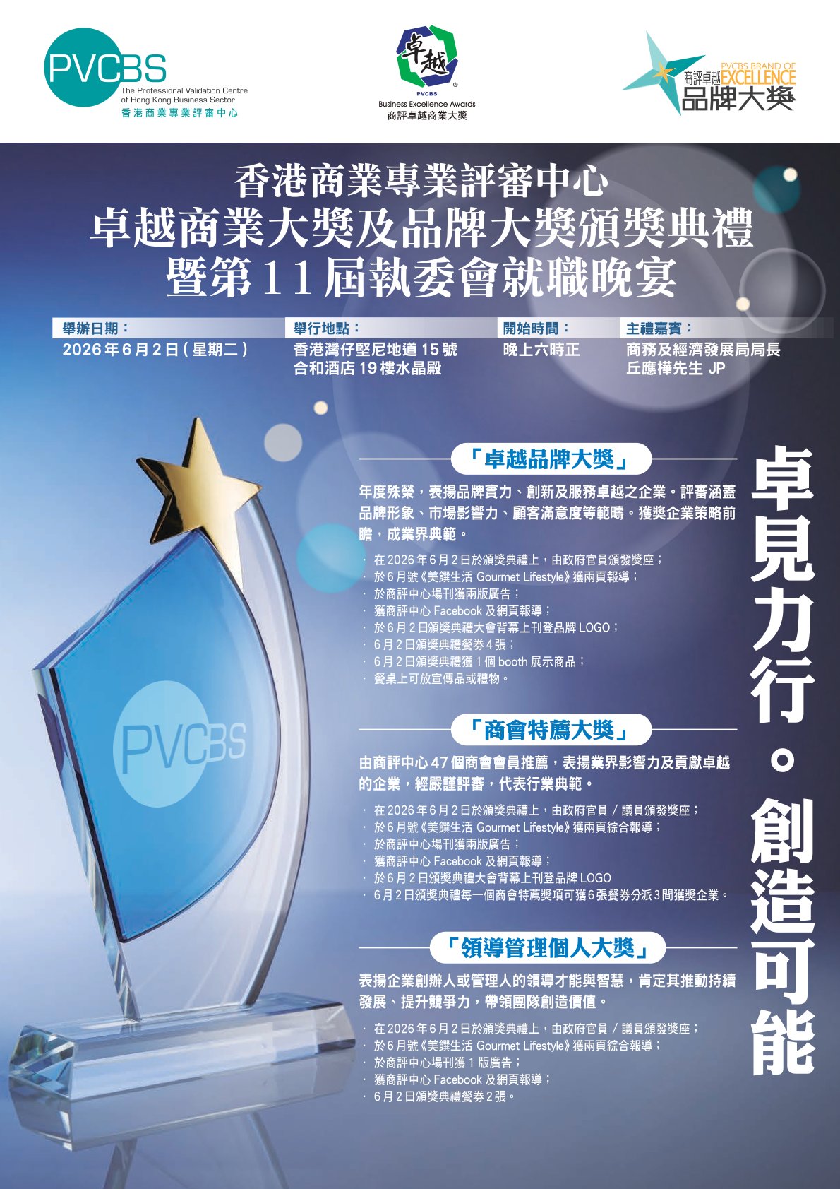 本年度的商評卓越商業大獎及品牌大獎頒獎典禮暨第十一屆執行委員會就職典禮謹訂於2026年6月2日舉行,有關典禮詳情如下: